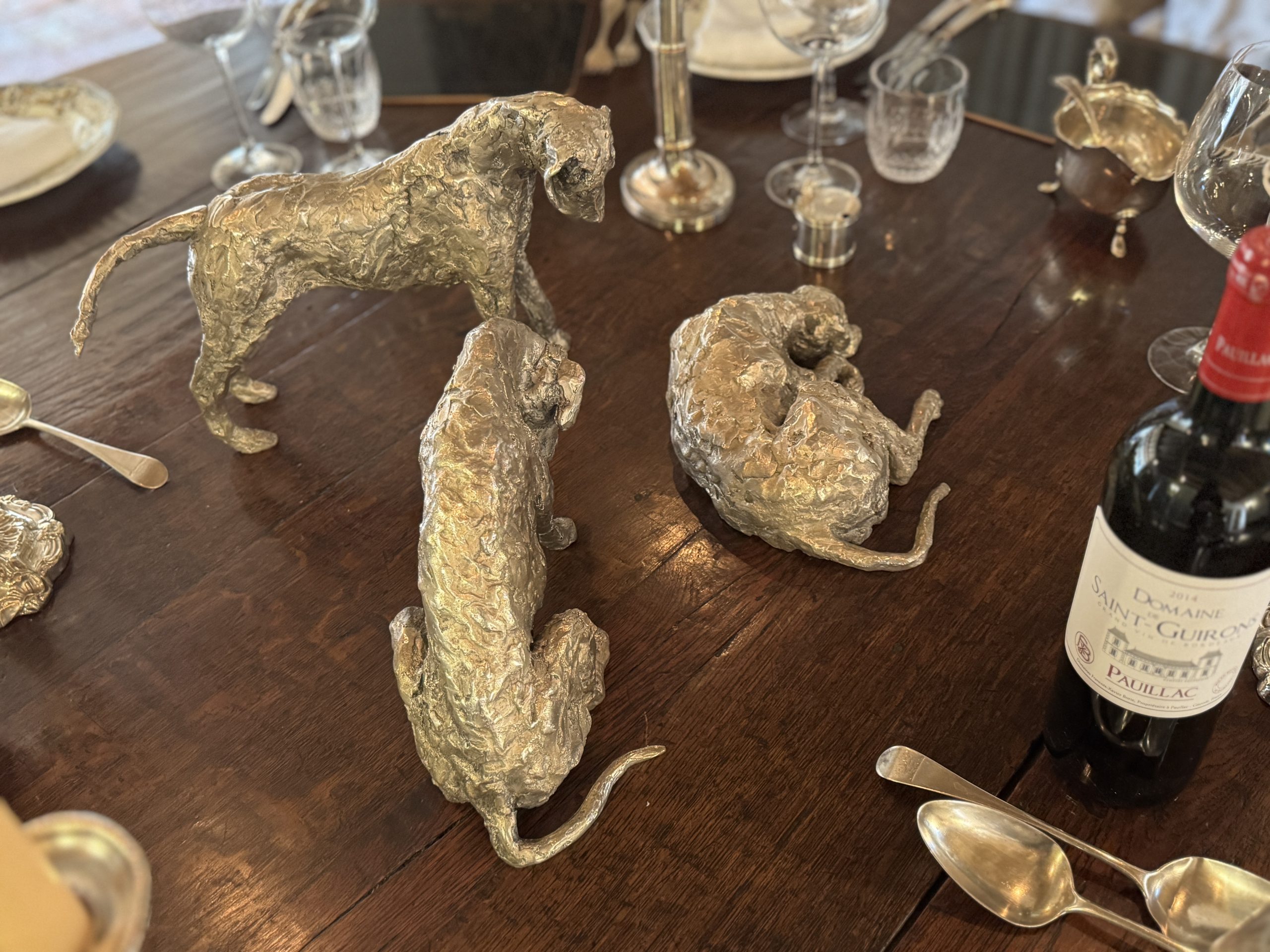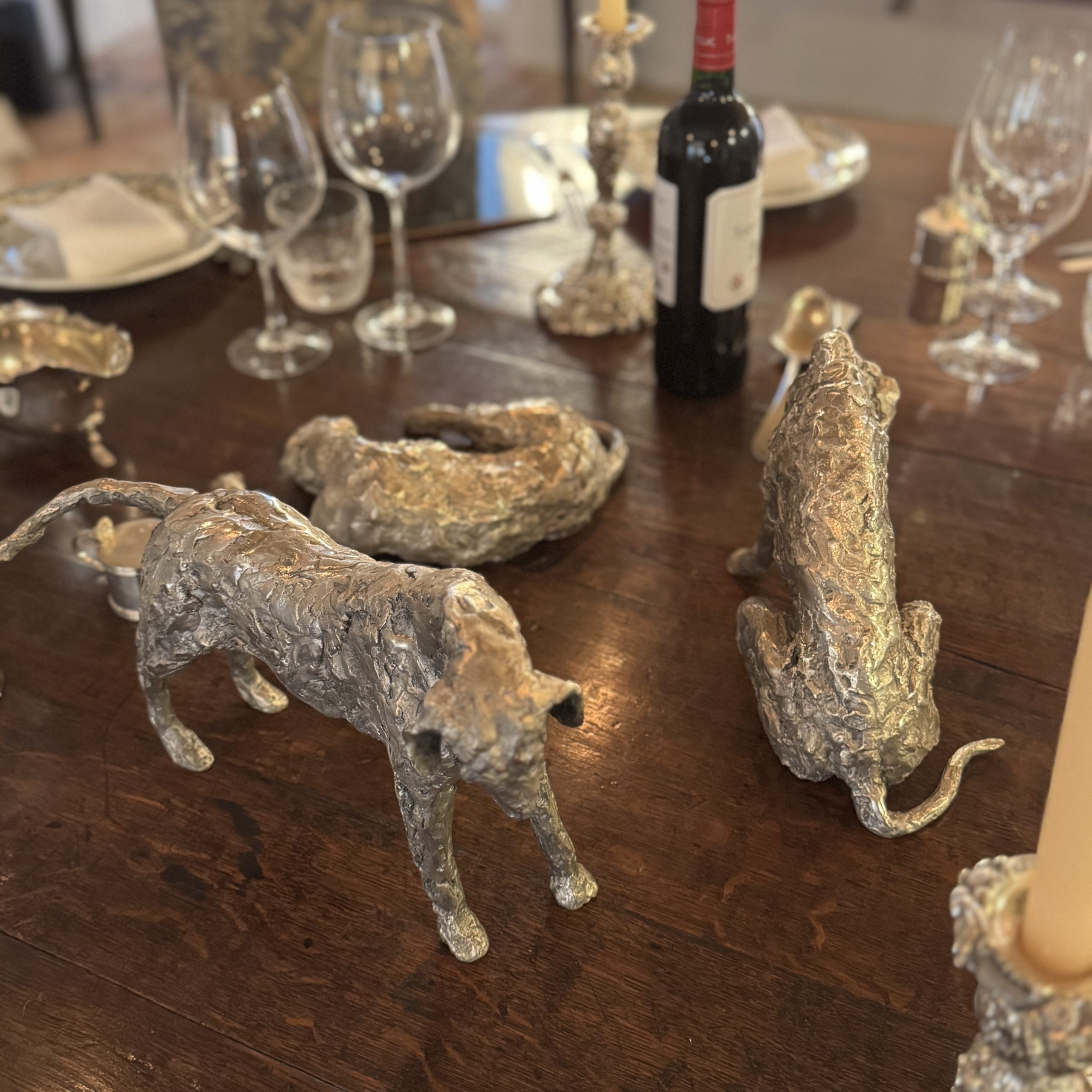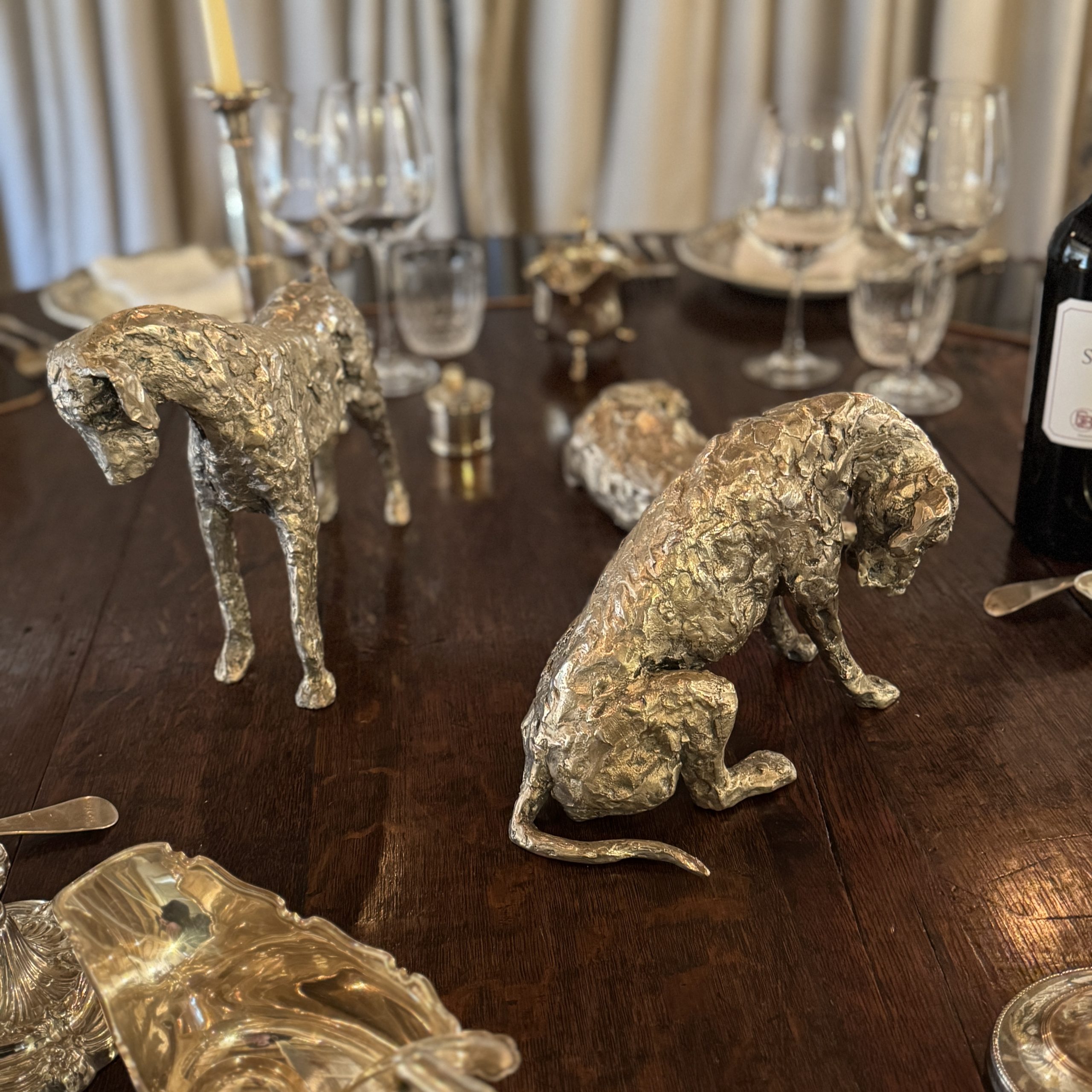 Jacquelines talent at depicting them is exceptional. They are so hound. Beautiful in Bronze, silvered bronze or silver, mounted or free standing. Generous scale but a good size to place anywhere. Utterly endearing – the most spectacular dining table art. Very versatile art to place capturing stunning movement and expression.